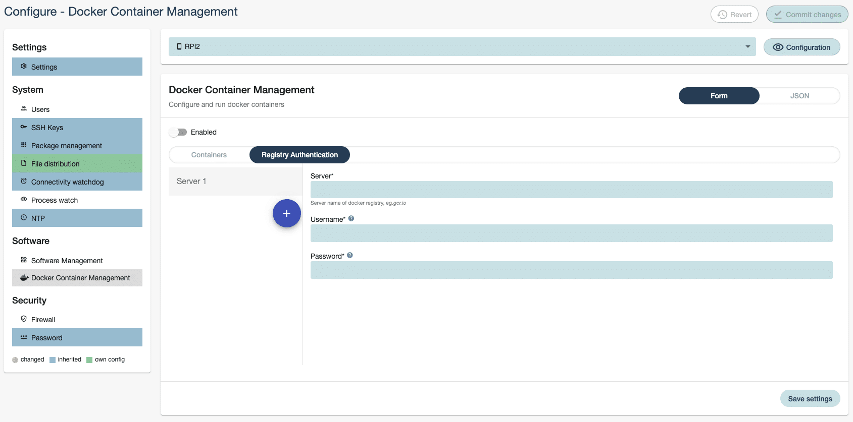 Then the first step is to define from which repository the containers are downloaded. If this is not defined the system uses docker hub. Please insert your hub URL and credentials in the according tab to connect the repository.