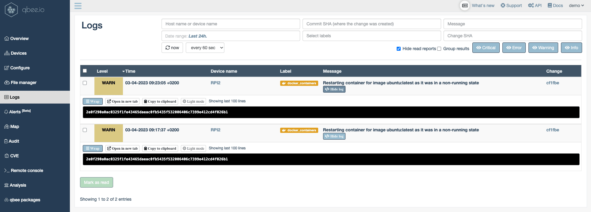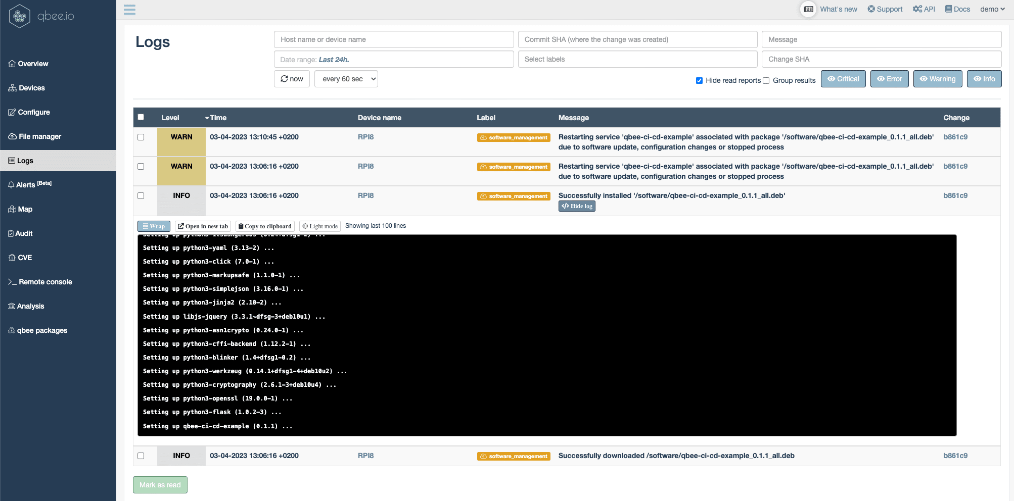 Within 5 minutes all online devices will have received the update and logs about the successful deployment are sent back to the system. These can be viewed in logs.