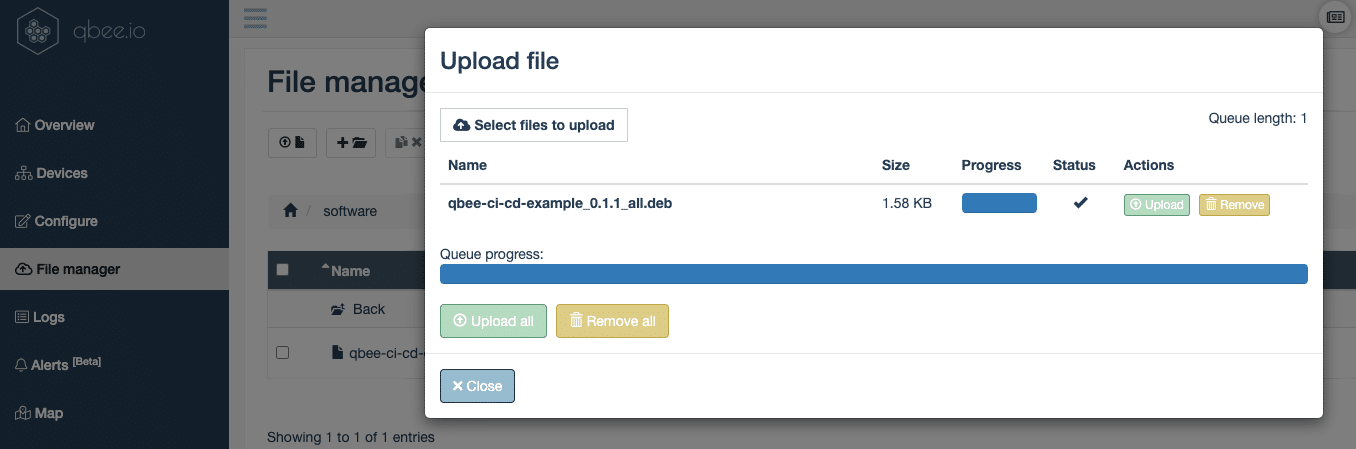 Simply upload your Debian package or binary to our file manager. This upload can happen through the graphical user interface and we support an API based upload to allow to connect this to third party systems such as Github and build CI / CD (continuous integration / continuous deployment) pipelines. Then qbee takes care of the over-the-air software updates.
